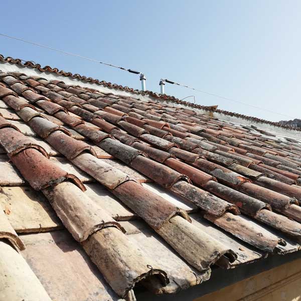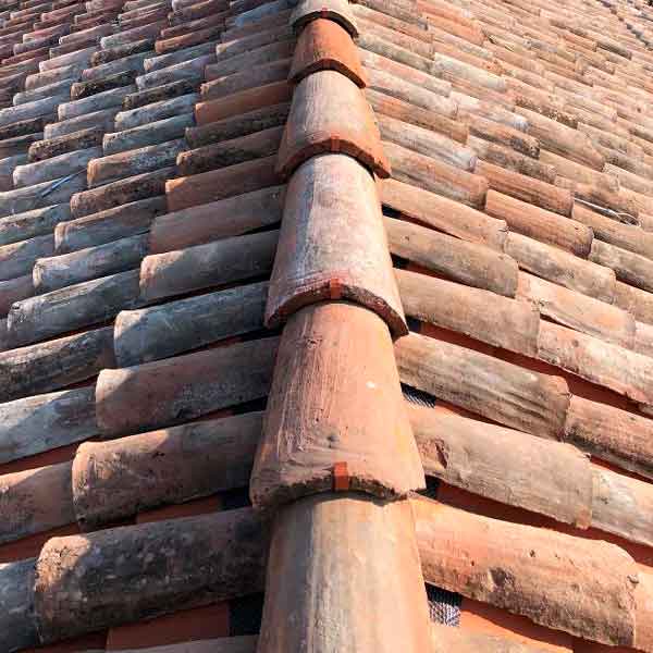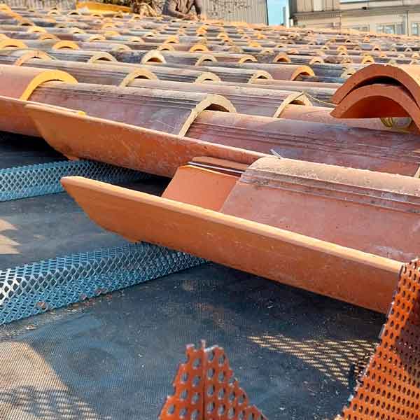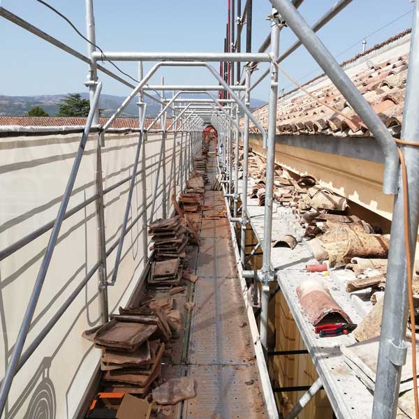 L’intervento ha riguardato il ripristino e la messa in sicurezza delle coperture, con un’attenzione specifica alla continuità della posa dei coppi su superfici di grande estensione.