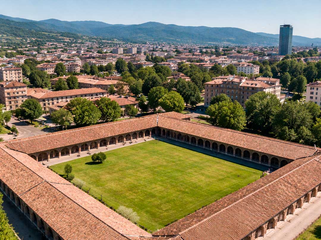 Il Lazzaretto di Bergamo è un grande complesso storico a impianto quadrangolare, caratterizzato da coperture estese e continue, sviluppate lungo il perimetro degli edifici che delimitano il cortile interno.