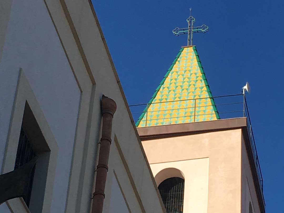 Negli anni 2000, la torre campanaria è stata dapprima oggetto di riqualificazione, ma lo stato della sua situazione ha portato presto a una decisione drastica: quella di sostituire la guglia in cemento armato con una molto più rispettosa dell’economia della costruzione - quindi in legno - sulla cui cuspide porre finalmente un rivestimento come quello pensato negli anni Cinquanta del Novecento, in mattoni maiolicati verdi e gialli.