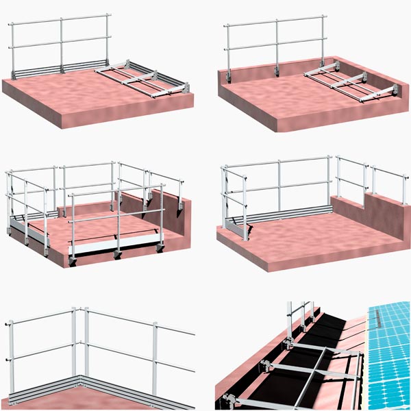 I Parapetti possono essere installati in molteplici configurazioni, fissati su superfici piane o a parete, oppure in appoggio sulla copertura con l'applicazione di appositi contrappesi.